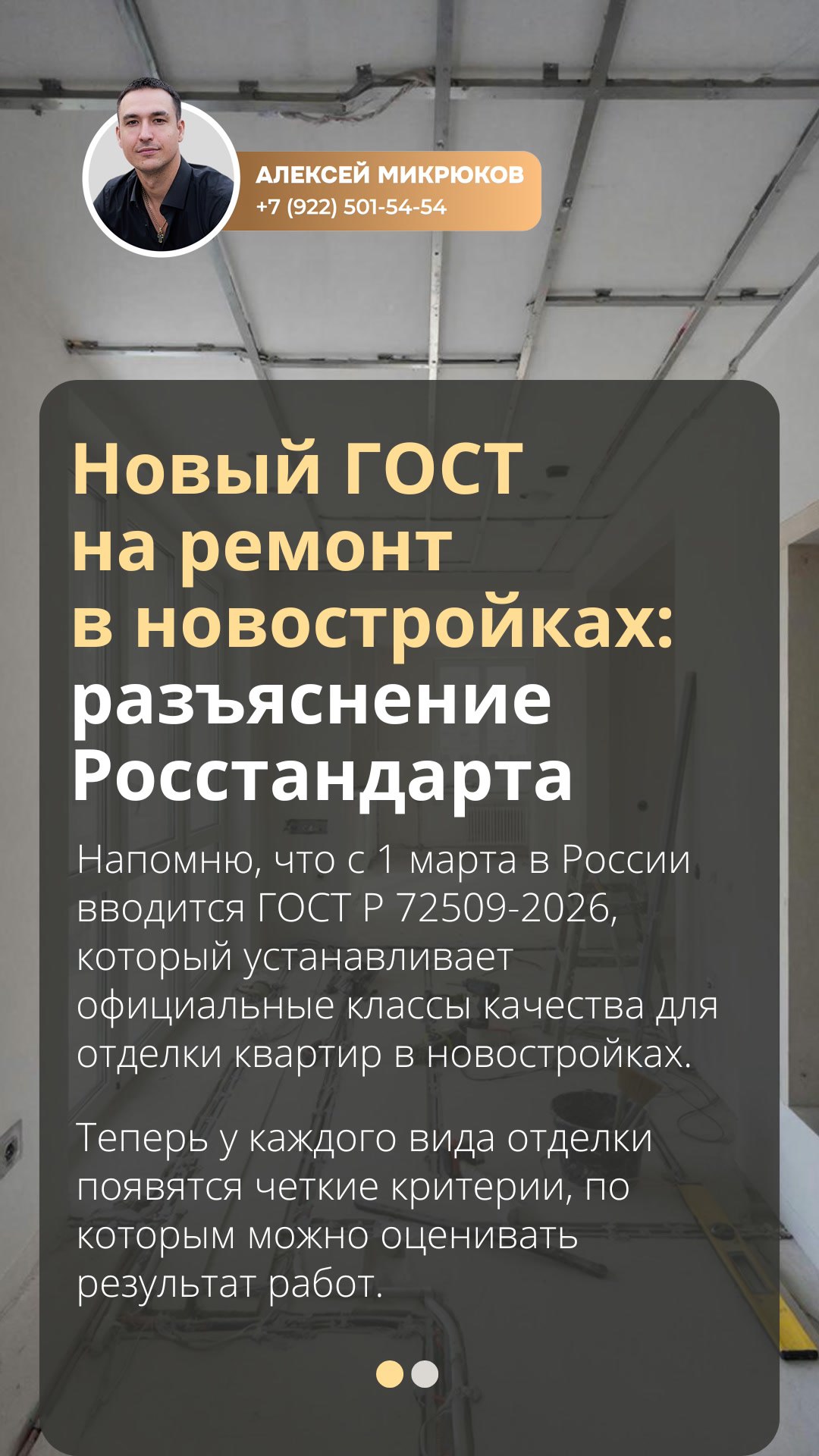 📋 С 1 марта в силу вступает ГОСТ Р 72509-2026 — первый официальный стандарт качества отделки в новостройках. Теперь для каждого элемента ремонта, от штукатурки до напольных покрытий, будут установлены чёткие классы качества.